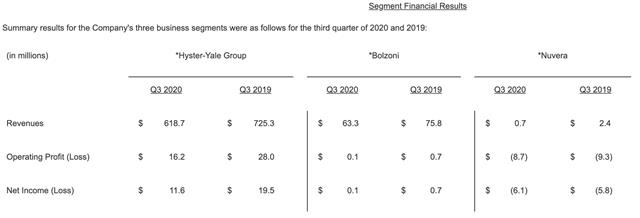 转载 2020-11-06 15:41 Hyster-Yale Source:Hyster-YaleHyster-Yale Materials Handling has announced consolidated revenues of USD652.4 million - down 14.8% for the third quarter of 2020. Profit was also slashed, down from USD19.5 million in Q3 2019 to USD7.3 million.