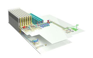 Herzstück der Logistiklösung, die Jungheinrich aus einer Hand liefert, ist ein 6-gassiges automatisches Paletten-Hochregallager (HRL) in Silobauweise mit 18.000 Stellplätzen – inklusive der Dach- und Wandverkleidungen. Die Ausmaße sind mit 80 Metern Länge, 75 Metern Breite und einer Höhe von 30 Metern stattlich. Hinzu kommt ein 2-gassiges, dreifach tiefes Kleinteile-Shuttle-Lager (SKL) mit Stellplätzen für insgesamt 40.000 Behälter.
