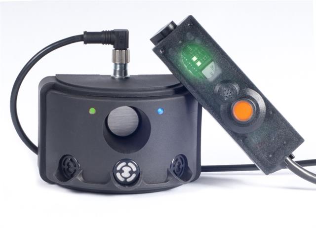 The system works with electric powered forklifts by detecting objects with the CySense ultrasonic detector mounted on the back of the forklift. The unit senses objects and pedestrians and then sends a signal to slow down the forklift.