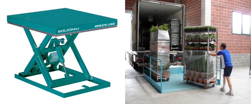 At an Italian import and export garden center, loading and unloading of vehicles by pedestrian truck, here the 1S Series Lift Table.
