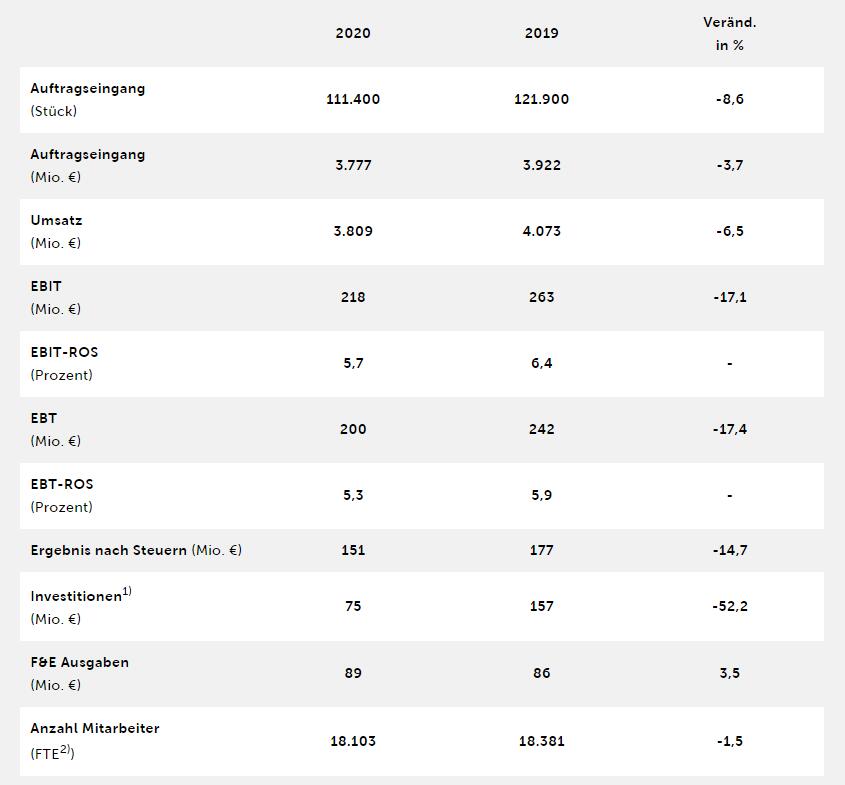 In einem maßgeblich durch den Ausbruch der COVID-19-Pandemie bestimmten Marktumfeld erreichte im Geschäftsjahr 2020 der Umsatz 3,81 Mrd. € (Vorjahr: 4,07 Mrd. €). Der Auftragseingangswert, der die Geschäftsfelder Neugeschäft, Miete und Gebrauchtgeräte sowie Kundendienst umfasst, erreichte 2020 aufgrund eines starken Schlussquartals 3,78 Mrd. € (Vorjahr: 3,92 Mrd. €). Beide Werte lagen damit leicht oberhalb des Prognosekorridors, der im Oktober 2020 angehoben worden war. Das EBIT erreichte mit 218 Mio. € (Vorjahr: 263 Mio. €) die obere Hälfte des avisierten Korridors, damit ergab sich eine EBIT-Rendite von 5,7 Prozent (Vorjahr: 6,4 Prozent). Das Ergebnis nach Steuern belief sich auf 151 Mio. € (Vorjahr: 177 Mio. €). Der Cashflow aus der laufenden Geschäftstätigkeit übertraf das Vorjahr deutlich mit 551 Mio. € (Vorjahr: 345 Mio. €). Zum 31. Dezember 2020 wurde zudem ein Nettoguthaben in Höhe von 194 Mio. € erzielt, zum Vergleichszeitpunkt im Vorjahr hatte der Konzern noch eine Nettoverschuldung von 172 Mio. € ausgewiesen. Das entspricht einer Verbesserung um 366 Mio. €. Treiber dieser guten Entwicklung waren die geringeren Investitionen, die Reduzierung der Mietflotte sowie die Freisetzung von Working Capital.