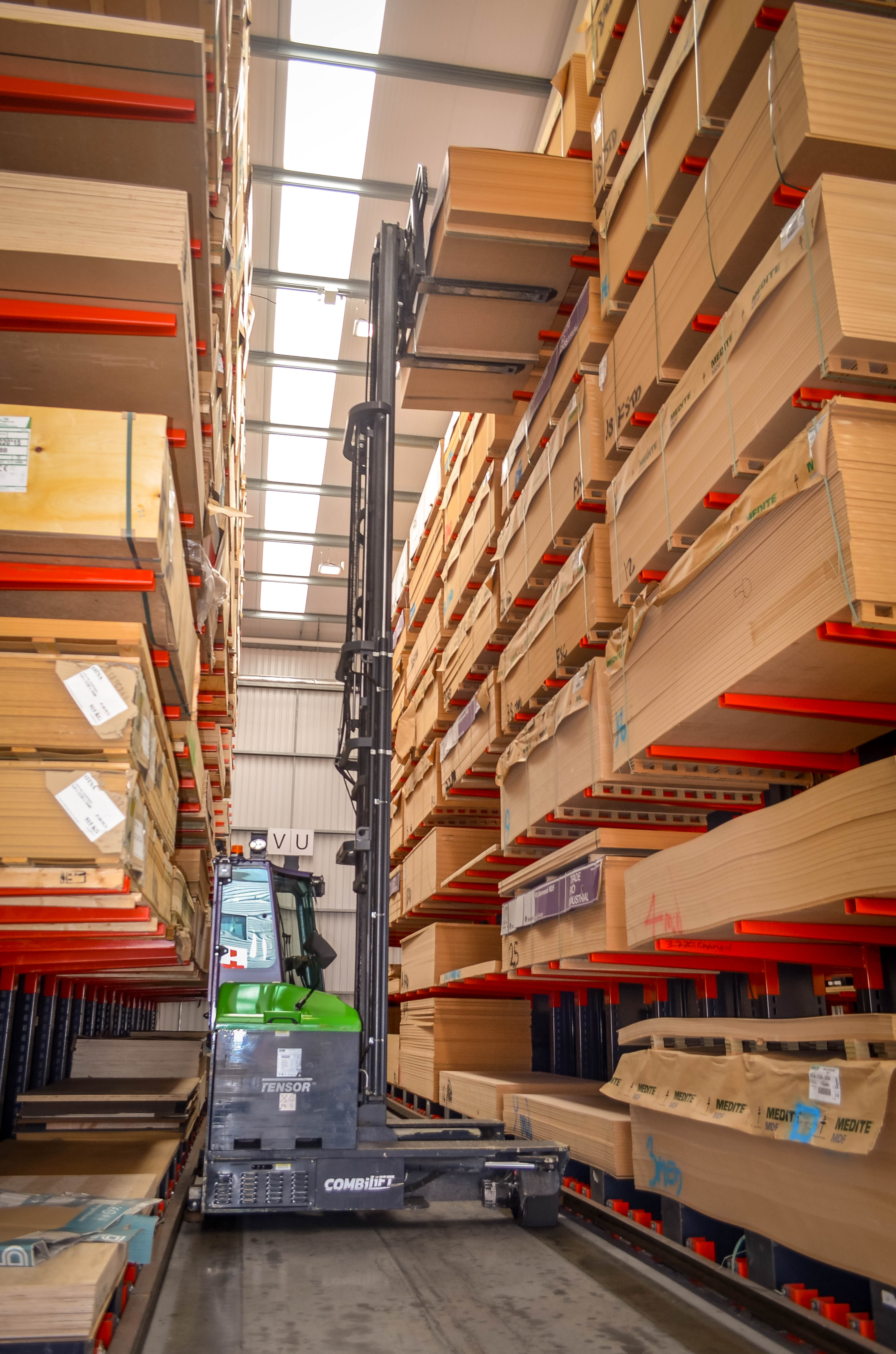 The ten Combilifts work constantly, offloading deliveries, putting products into racking and reloading for despatch. With their 4t base capacity and lifting capability of 2t to 9.4m, they handle loads which can be up to 4.5m long. They work in guided aisles of 2520mm and in some free roaming aisles set aside for the storage of 3m x 2m jumbo boards. For these larger loads, four trucks have been fitted with telescopic forks which measure 2050mm when extended. These can lift 1900 kg at 1035 load centre to 7.8m.