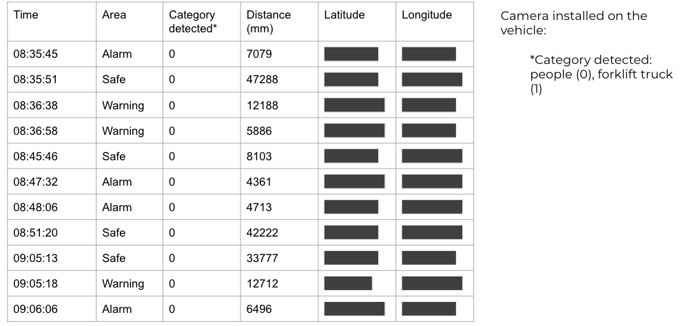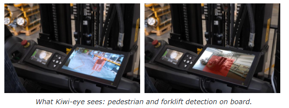 Kiwi-eye is able to detect both pedestrians, forklifts and markers with a high degree of accuracy and selectivity. The camera uses sensors with high standards of responsiveness both indoors and outdoors.How does it work?The system continuously processes real-time streams of video data to detect objects in the environment. Thanks to advanced algorithms, personal information is not captured. Kiwi-eye detects either pedestrians and forklifts with a detection field up to 25 meters and measures distances within centimeters. When an obstacle has been detected, Kiwi-eye immediately alerts the driver with an acoustic and a lighting signal. There are three alarm zones (alarm, warning, safe) that can be set up according to the running signal of the machine. The system interfaces directly with the machine, it's easy to install, set up and use. Kiwi-eye is more than an additional accessory: it's a driver assistance system that adds a competitive value to businesses.