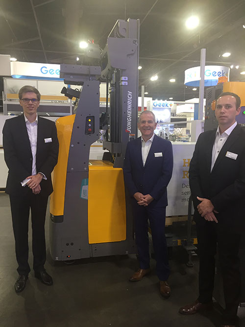 During the event, company leaders focused on two automatic guided vehicles (AGVs): the EZS 350a NA (based on Jungheinrich’s standard series tow tractor) and the EKS 215a (based on its stacker).