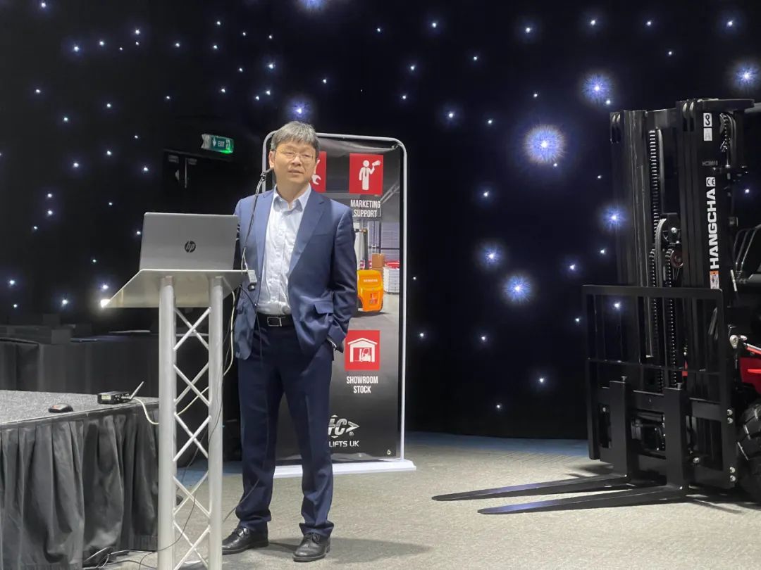 Pat, Sales Dept. Manager of HangchaDuring the day, the latest Hangcha products such as XE series lithium forklifts, and 16t XH series high-voltage lithium forklifts were presented and surprised all the dealers with their great performances. Pat, sales dept. manager of Hangcha shared the growth trend of global, Europe, how well Hangcha perform last year with a 70% growth in overseas revenue, and our plan that focuses on new energy forklifts, such as lithium and hydrogen fuel cell forklifts.