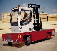 Side loader with turbo diesel engine and pneumatic tyres 27x10-12, suitable for high speed and efficient transport of long materials either inside or outside and on uneven ground.