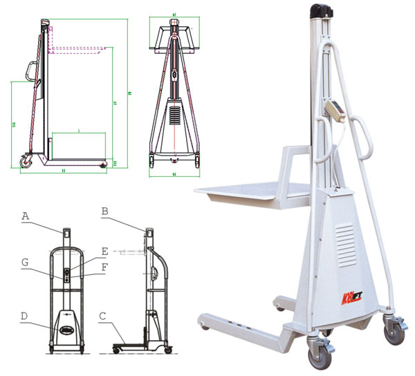 A: Capacity limitation B: Warning C: Danger! "Watch Your Step" D: Logo E: Switch F: Recharging G: Power Lifter-Transporter 1KG=2.2LB 1INCH="25.4MM