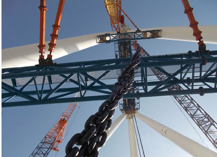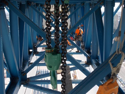 The air operated hoists were located at a temporary chain fall platform suspended below the wheel central hub, and utilised their 280ft of cable fall to lift equipment from the ground level. These lifts included 18 temporary radial struts, each being 40 tons in weight, together with transfer trusses of similar weights and all the individual outer rim segments of the completed wheel, together with a total of 112 cable locking assemblies initially assembled at 50 percent tension loads. The temporary radial struts were installed to provide the accurate spacing of the individual wheel rim segments from the central hub unit during initial build assembly. These were then sequentially replaced by the cable locking assemblies, which when fully tensioned provided the radial spokes of the completed wheel assembly.