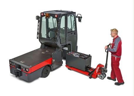 The battery change of the new tractors and load transporters from Linde Material Handling is carried out quickly and easily via a lateral flap on the truck using roller conveyors or a pallet lift truck.
