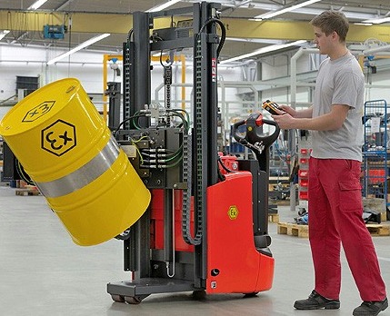 Thanks to the drum tipper with explosion protection—a customer-specific solution—open drums can be gripped and specific amounts can be filled or metered on a scale. The handling characteristics make it easier to manoeuvre via remote control, which is performed using both hands for safety reasons.
