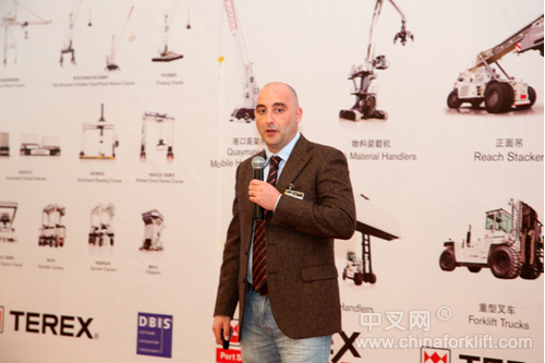 Francesco DePasquale, Department Manager for mobile harbour cranes&fork lift trucks, presentingthe Quaymate M50 mobile harbour crane and the forklift trucks. These machines are now all manufactured in China.