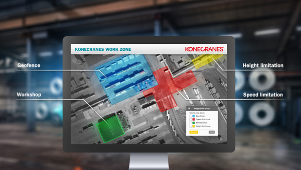 As a part of Work Zone, Konecranes introduces geofencing, a new safety and yard efficiency product which uses GPS technology to create virtual fences around real-world areas. These areas can then be used to trigger user defined alerts, this can be information about height limitations, speed limits or other safety matters. The alerts can be displayed on the driver’s display or by SMS or email to chosen recipients.