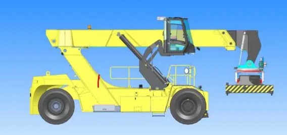 The new moveable cab is raised and lowered smoothly on a hinged arm and the speed can be adjusted. The container handling truck will continue to operate when the cabin is raised but the speed is automatically reduced to 10Km/h, and both doors must be closed.