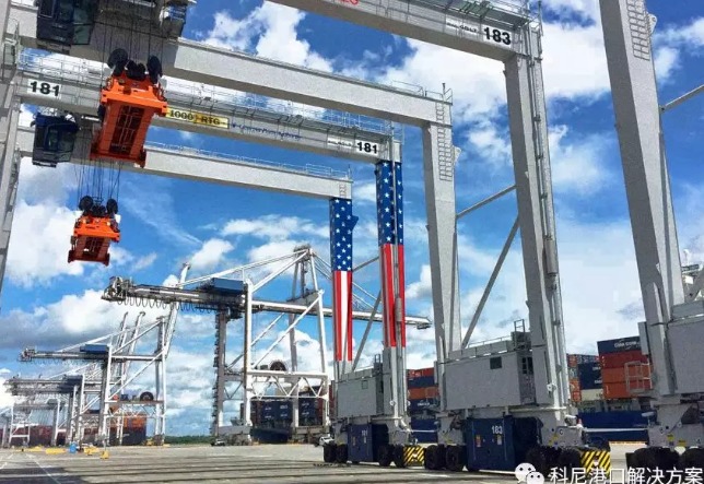 Below you see the 1000th RTG made and delivered by Konecranes: crane number 181 in the middle. We decked out two of its legs in the Stars and Stripes in honor of the occasion. We have delivered over 140 RTGs to the Port of Savannah, the largest single container terminal in North America.