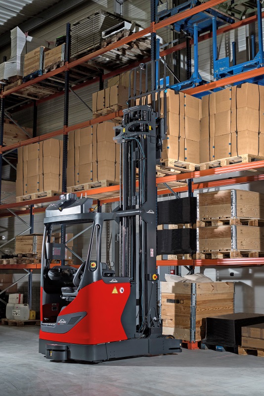 The autonomous Linde R-MATIC reach truck transports palletized goods of up to 1.6 tons fully automatically to high-bay racks, storing and retrieving them independently at lifting heights of up to ten meters.