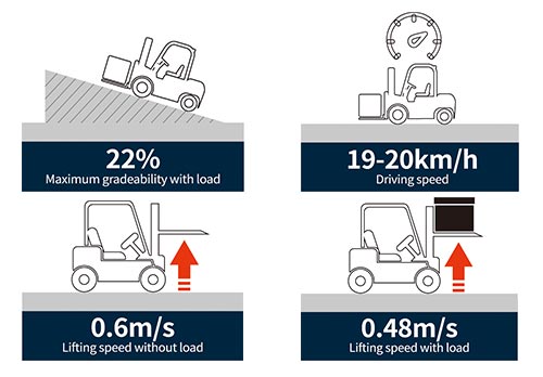 HELI New series lithium-ion Forklift has three configurations for customer choice: S/M/H. The last two types are comparable with internal combustion trucks in terms of comprehensive performance.