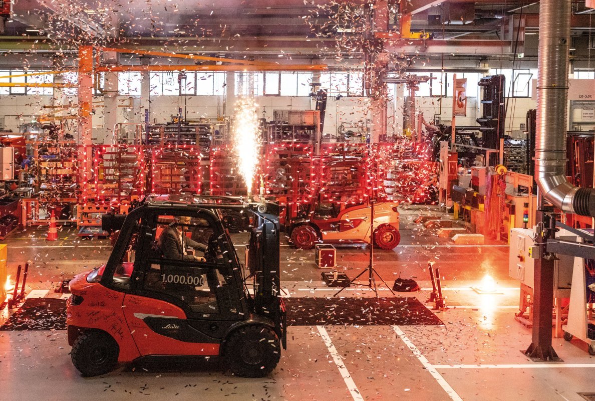 A dazzling indoor fireworks display marked the occasion as the one-millionth counterbalance truck produced at Linde Material Handling’s Aschaffenburg plant left the assembly line. Photo: Linde Material Handling GmbH, Aschaffenburg