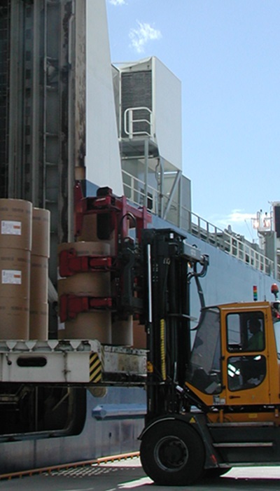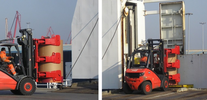 Typical attachments used for paper handling in ports include single- and double-tower clamps, rotating and tilting paper roll clamps, to suit the specific application.