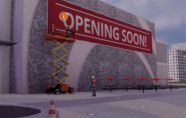 The new scenario features JLG equipment at work in an indoor/outdoor retail complex