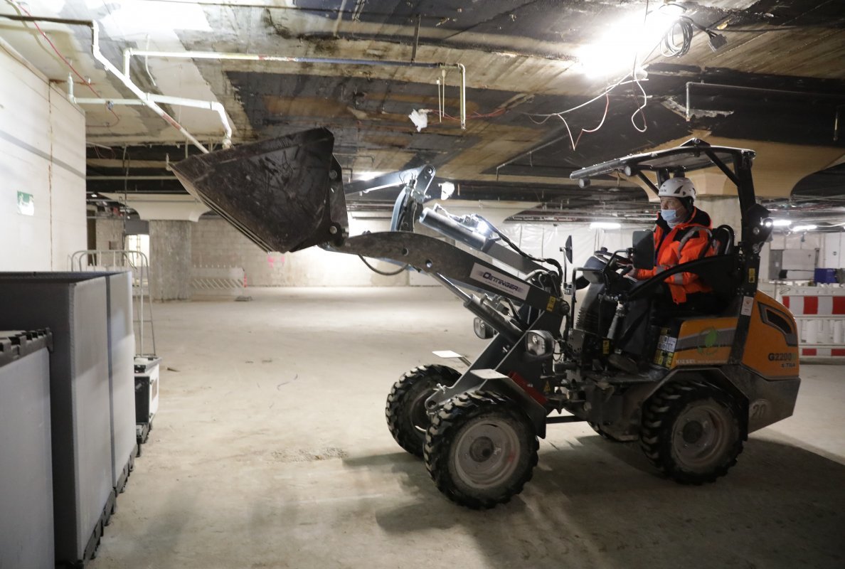 Frankfurt, main station: Later, there will be people striding along shops and passengers walking quickly up to the trains of the S-Bahn. At the moment, a GIANT G2200E X-TRA is busy in this space for the whole day. Its job is to transport all the sorted waste out of the way, so that the workers get ahead with their work quickly. Since autumn of 2020 17 employees of the Oettinger GmbH from Malsch, Germany, are working on the underground site on the reconstruction of the intermediate level. They tear out walls and renovate the stair cases that lead to the main station. During this process a lot of material from the former structures have to be torn out and transported away.