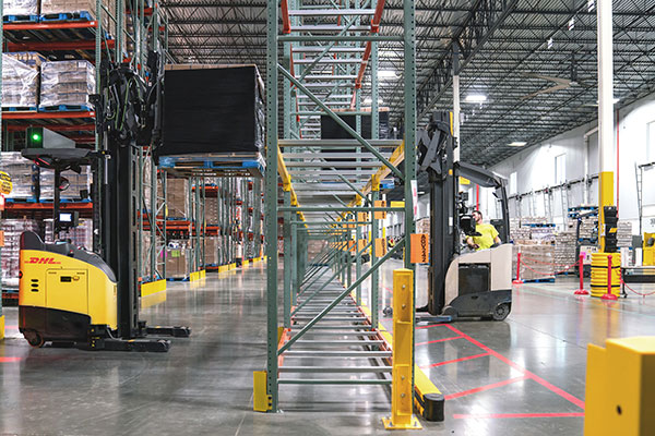 Autonomous reach trucks are capable of storing and retrieving pallets up to five levels high in the DHL facility.