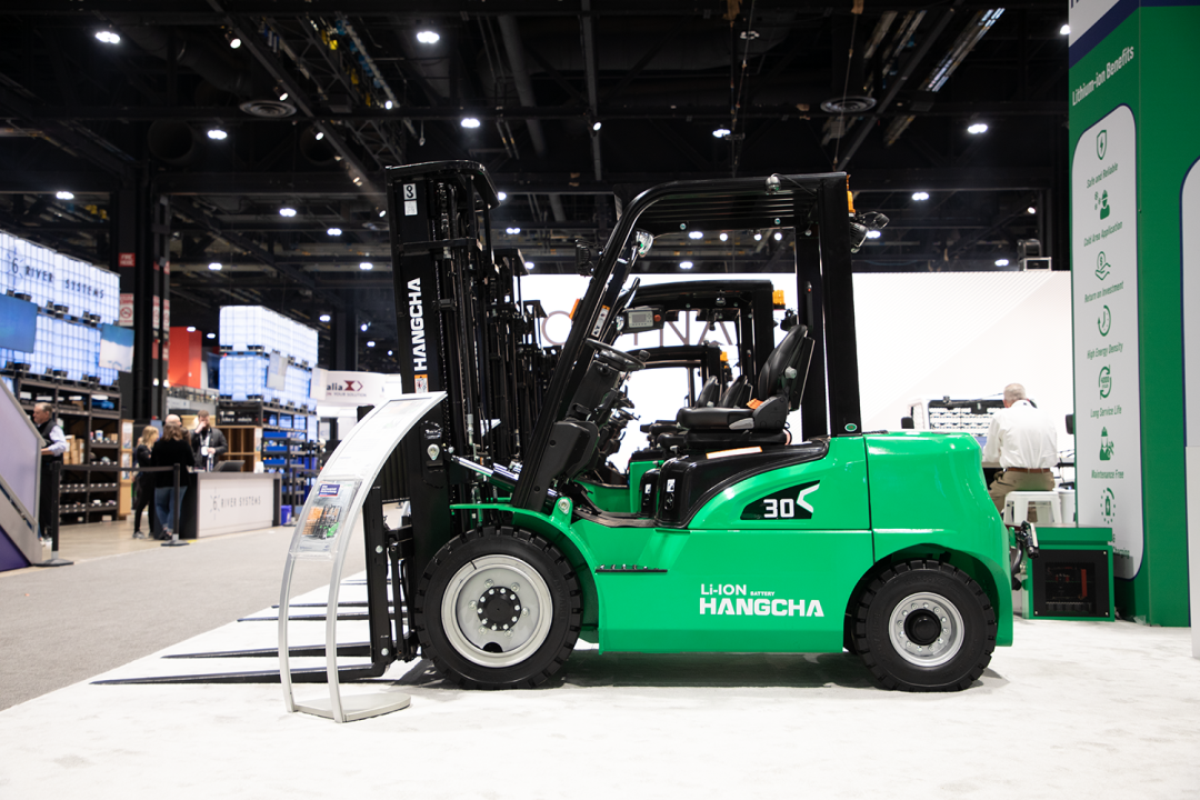 At PROMAT 2023, we displayed 20 differentunits from Hangcha’s full line of material handling equipment. Both end-users and dealers were excited to see all the equipment that we brought to the show. The new 12,000lb X Series Electric Lithium-ion Cushion Tire Forklift and 4,000lb XC Series 3-Wheel Electric Lithium-ion Forklift both drew attendees to our booth.However, once in the booth, attendees quickly crowded over the new 6,000lb XE Series Electric Lithium-ion Pneumatic Forklift.This new forklift uses the same design elements as a similar I.C. powered forklift, including larger tires and better ground clearance,to finally give attendees an electric lithium-ion forklift that is directly comparable to a similar I.C. model. With over 16 different models from Hangcha’s full line of lithium-ion material handling equipment, attendees were able to learn how to easily see green with maintenance-free Lithium Iron Phosphate (LiFePO4) battery packs, opportunity charging, rapid charging, and long run times.