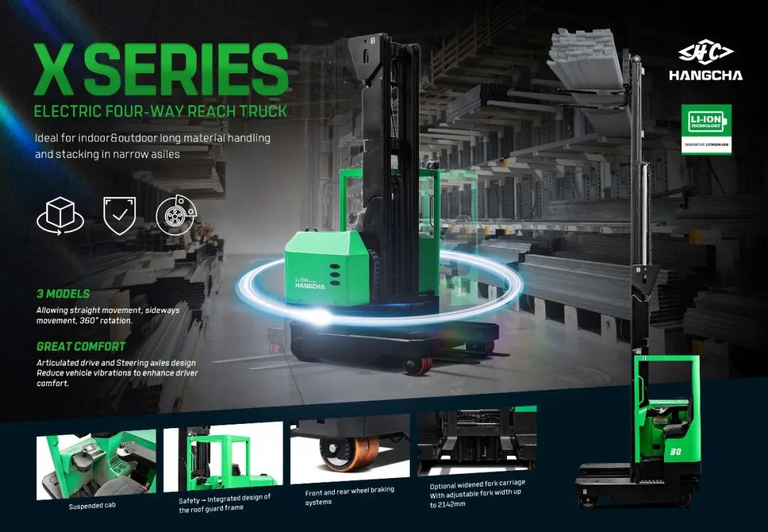 We are pleased to introduce our latest product specifically designed for handling long materials - the X Series Electric Four-Way Reach Truckwith a capacity of 2,000 to 3,000kg and utilizes the 80V system, ideal for indoor and outdoor long material handling and stacking in narrow aisles.