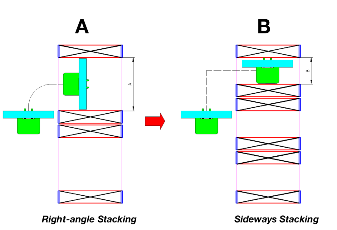 With the implementation of sideways mode, the aisle width can be significantly reduced from A to B, greatly increasing warehouse utilization efficiency.